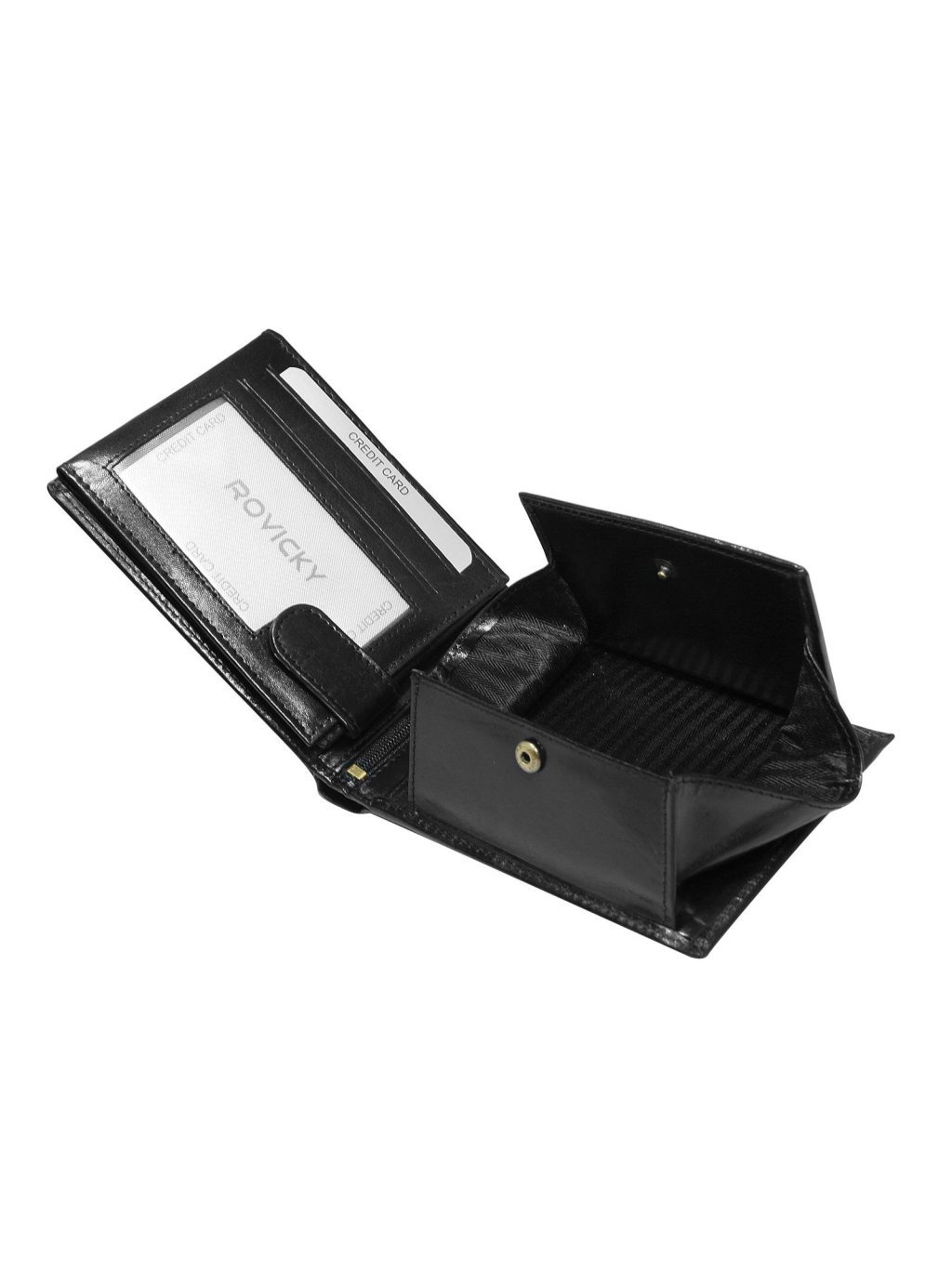 Elegantní pánská kožená peněženka značky ROVICKY. Uvnitř peněženky najdete drukem uzavíratelnou kapsičku na drobné mince, přihrádky na doklady, věrnostní karty i platební karty. Fochy na papírové bankovky jsou podšité látkovou podšívkou. Peněženka je ušitá z kvalitní přírodní kůže a je po obvodu prošitá pevnou nití, což zvyšuje její životnost.