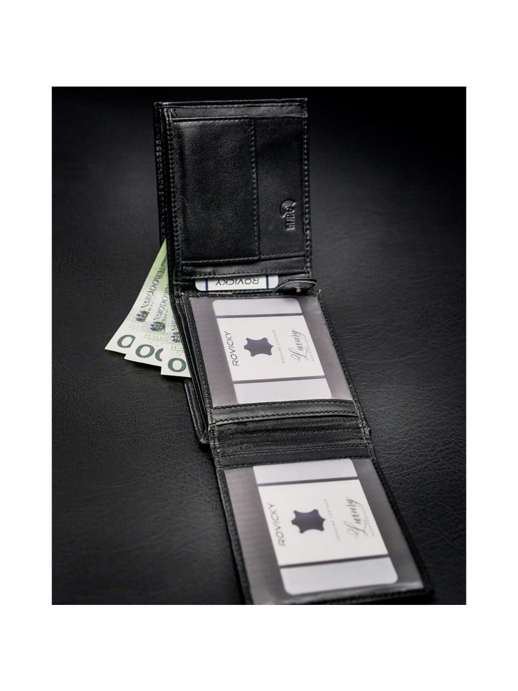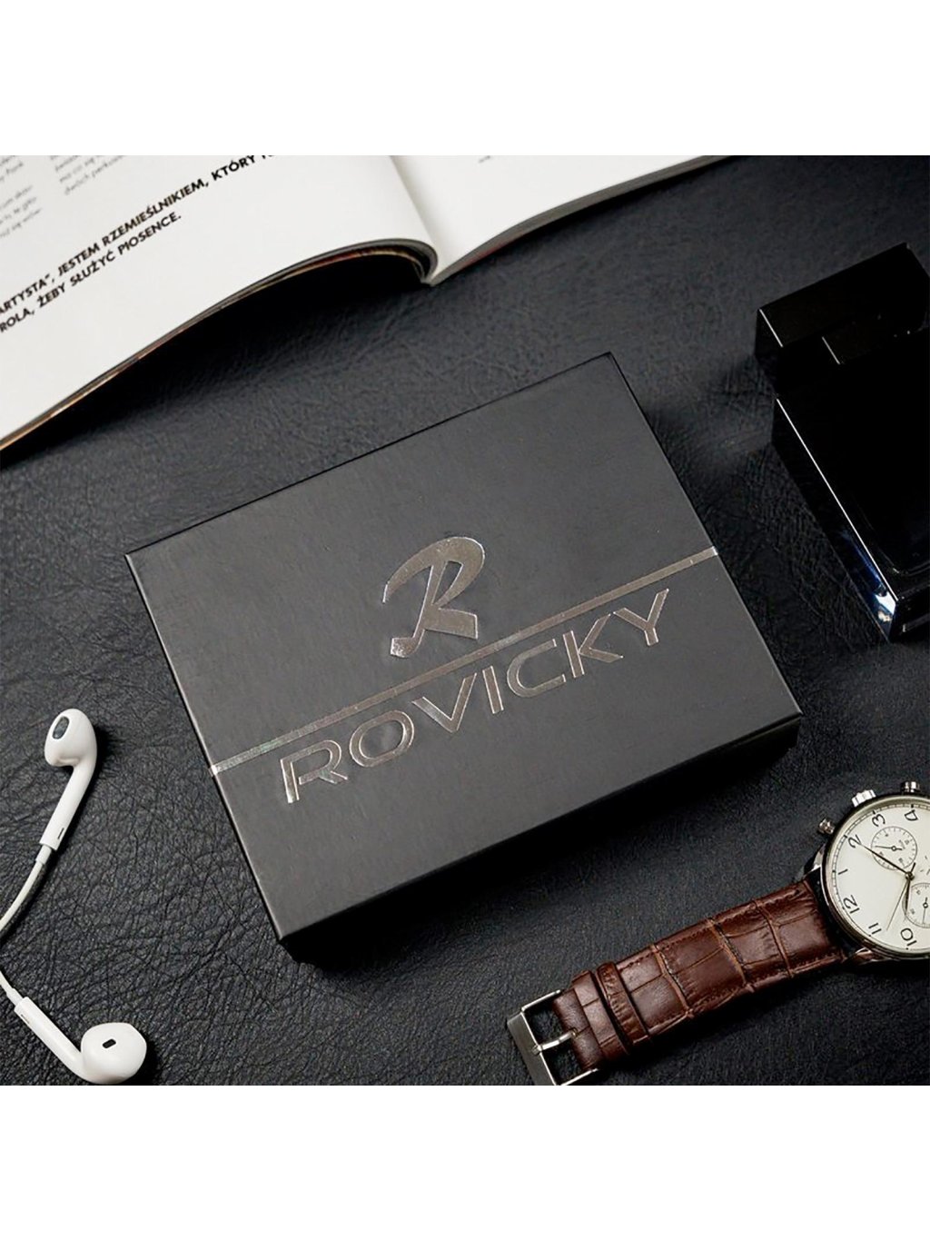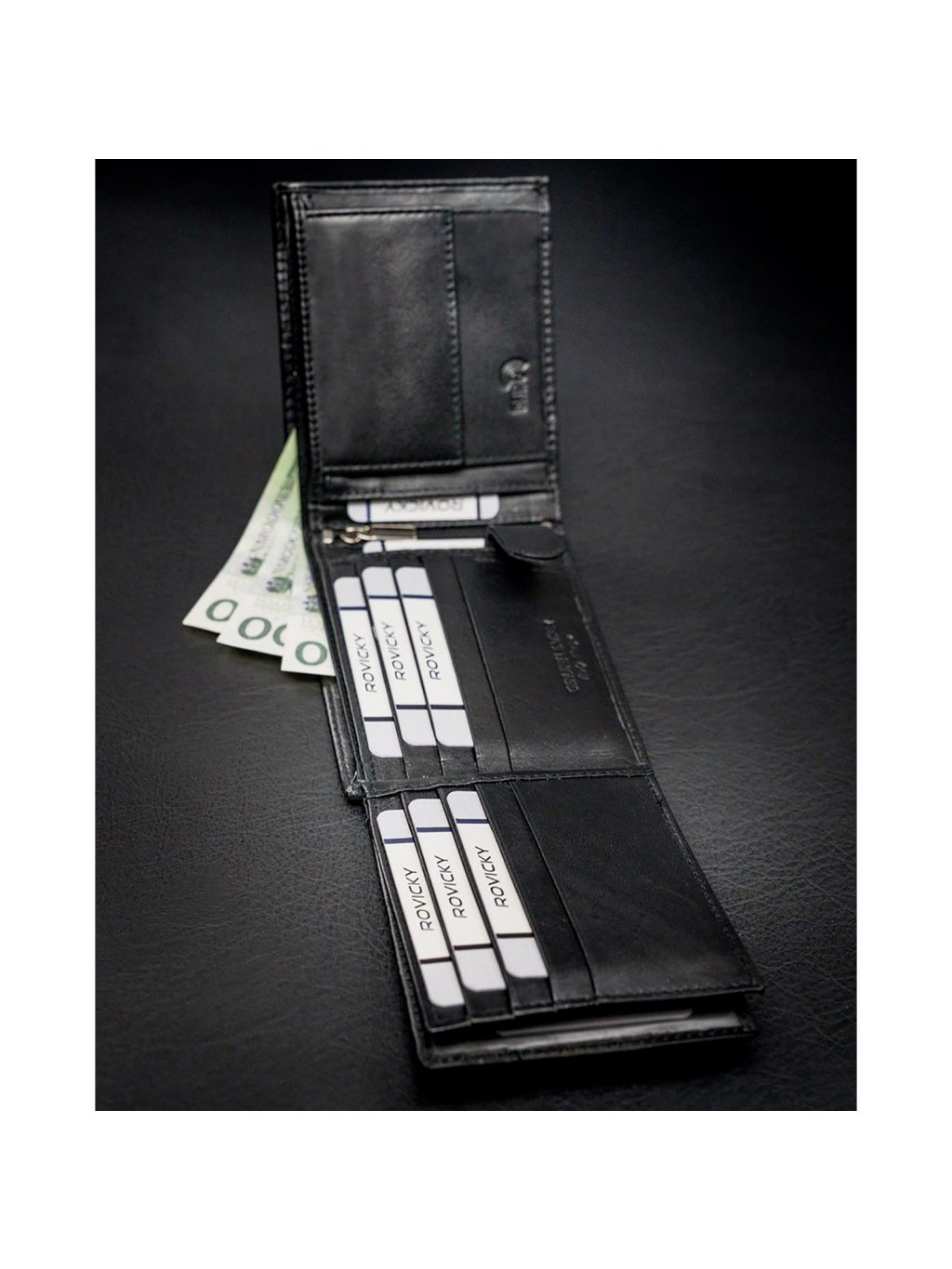Pánská kožená na šířku orientovaná peněženka značky Rovicky. Uvnitř peněženky najdete kapsičku na mince se zapínáním na druk, přihrádky na doklady, věrnostní i kreditní malou karty. V horní části peněženky jsou fochy na papírové bankovky, které jsou podšité látkovou podšívkou. Peněženka je ušita z kvalitní pravé kůže a po obvodu prošita silnou nití, což zvyšuje její odolnost. Peněženka je dodávaná v papírové krabičce, díky které se z ní může stát úžasný dárek.