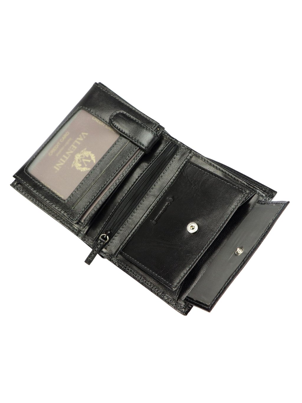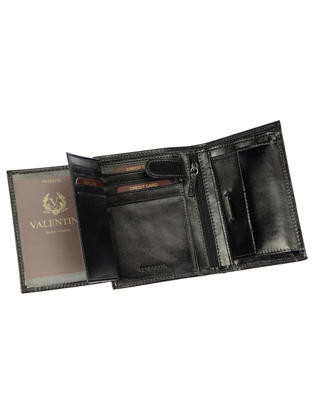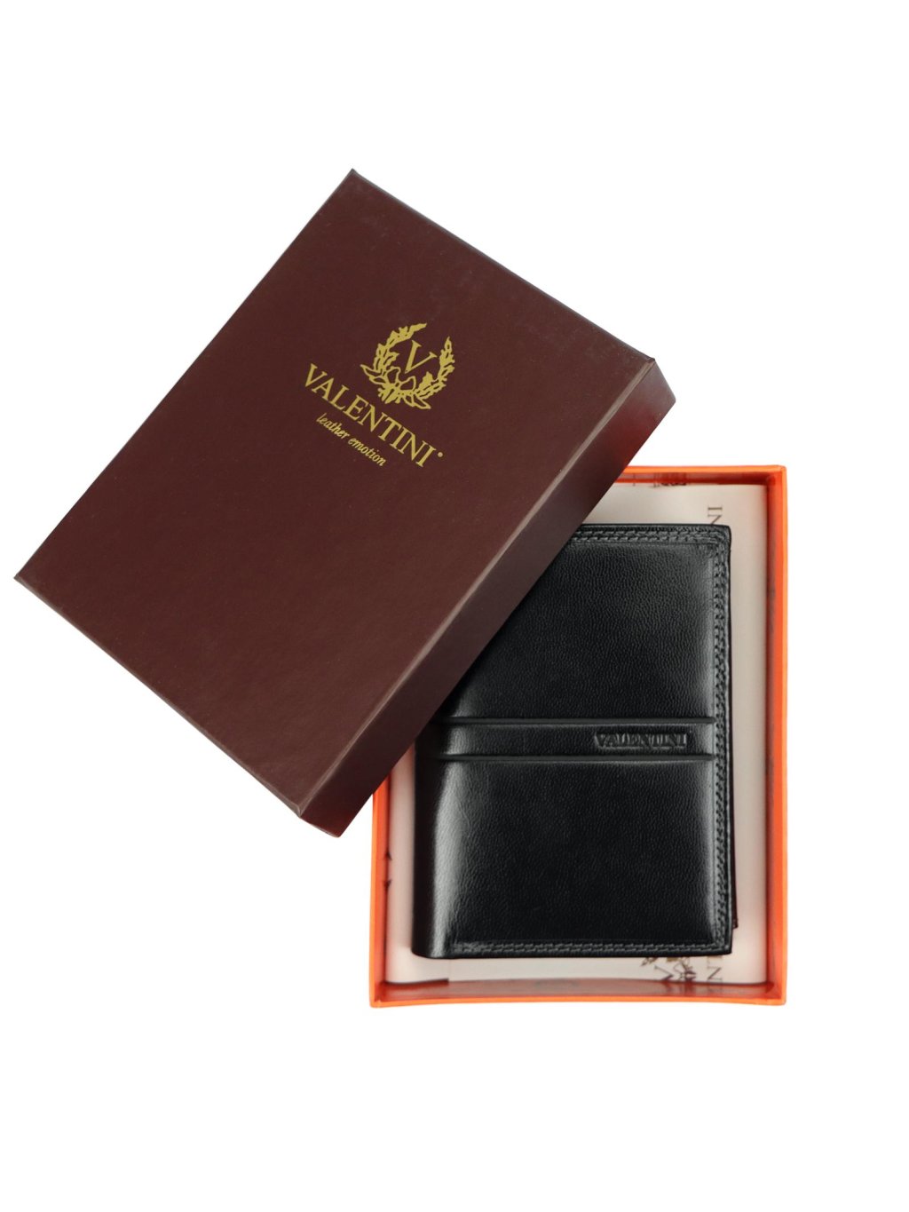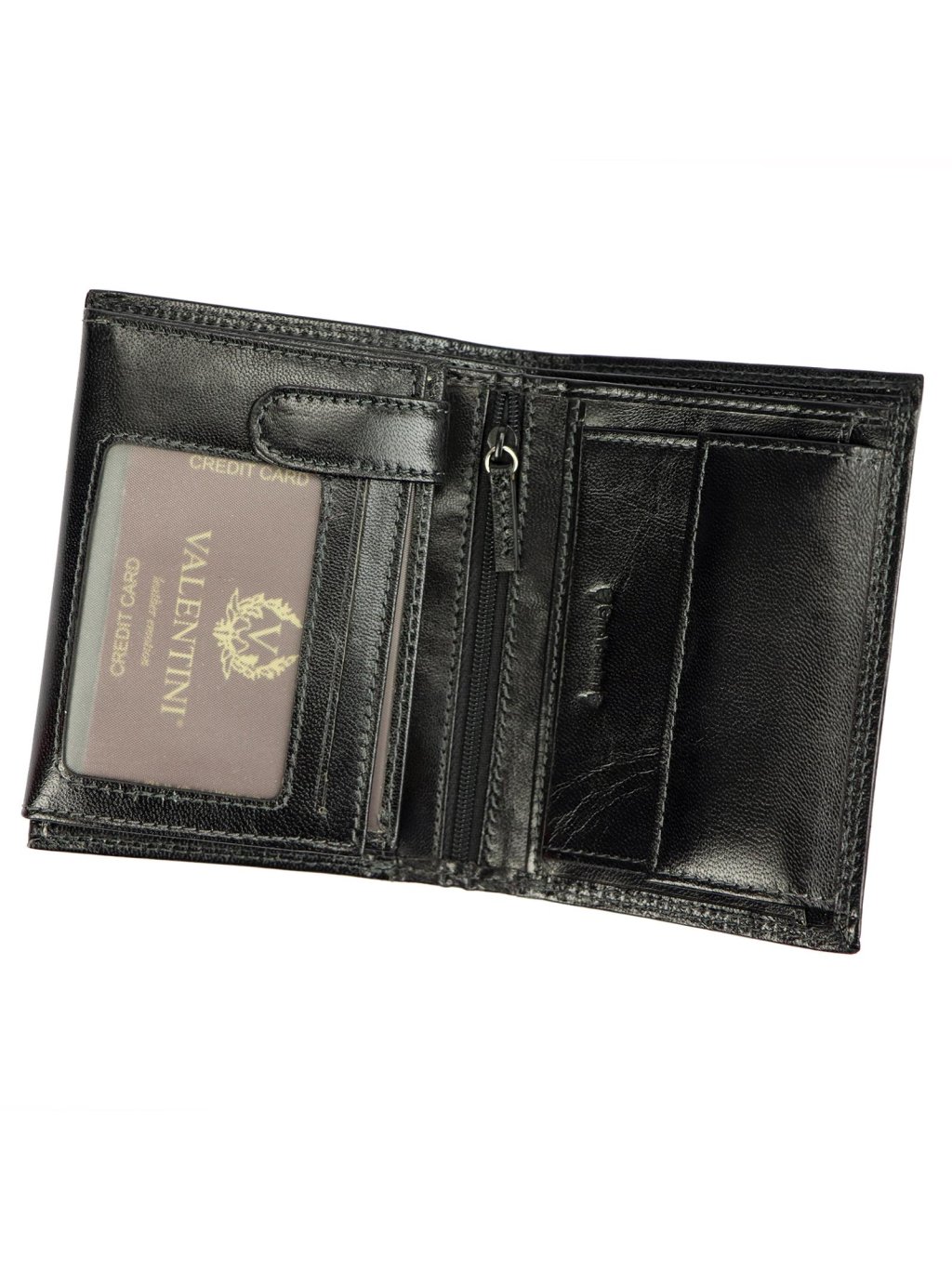 Klasická pánská na výšku orientovaná peněženka značky Valentini. Celá peněženka je ušitá z pravé přírodní hovězí kůže, která je hladká a příjemná na dotek. Peněženka je po celém svém obvodu pevně prošitá nití, což zvyšuje její životnost. Decentní logo výrobce je vyraženo na přední straně. Vnitřek peněženky je rozdělen na dvě části. V jedné části se nachází drukem uzavíratelný mincovník na drobné mince ve druhé části jsou praktické přihrádky na kreditní karty, věrnostní karty i doklady. Dva fochy na papírové bankovky jsou umístěny na vrchní části peněženky.