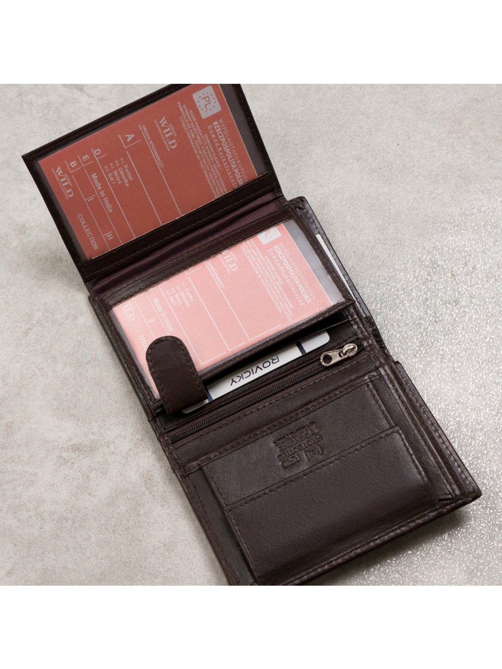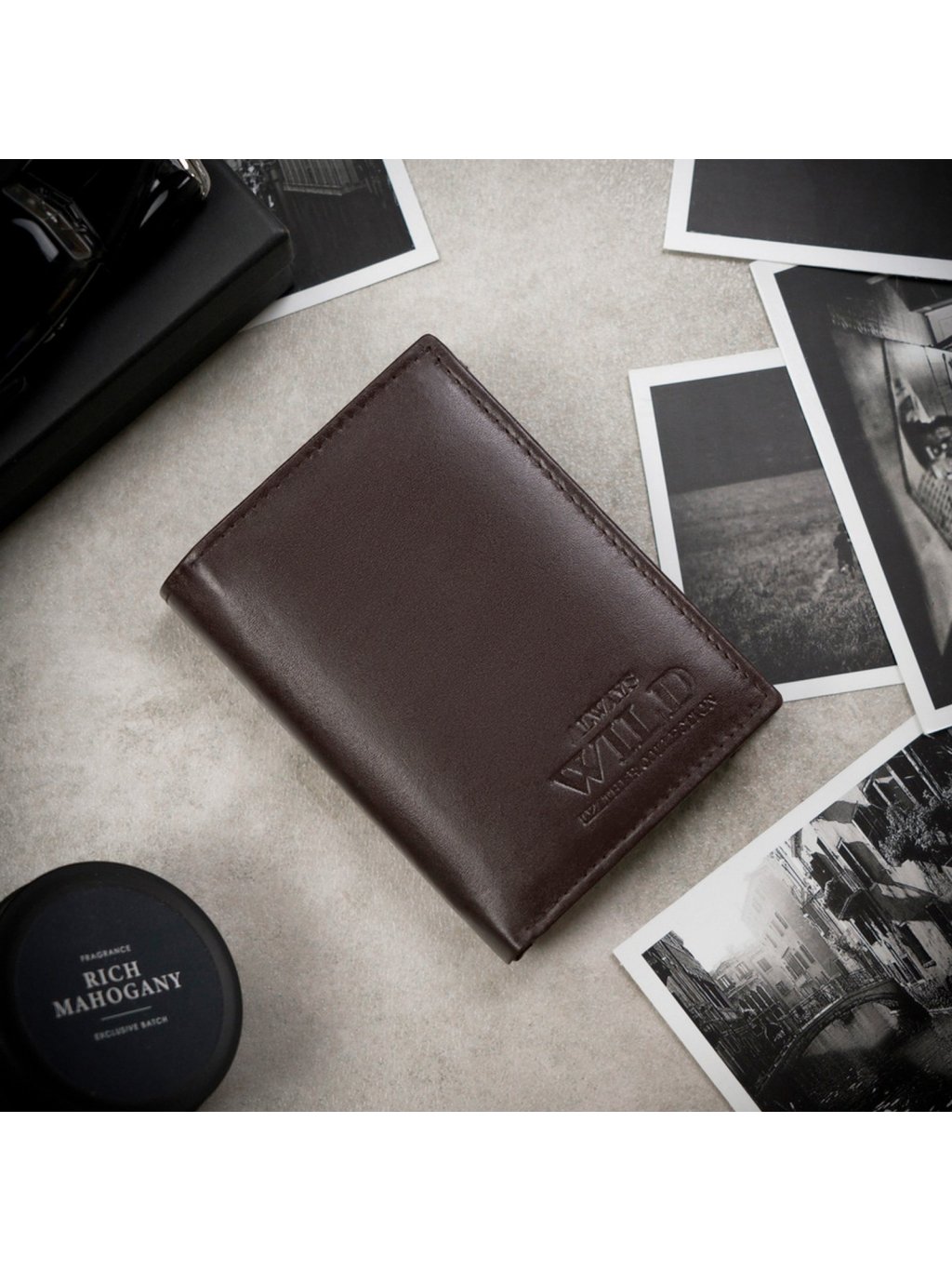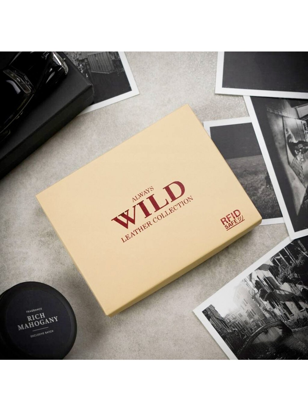 Pánská kožená na výšku orientovaná peněženka značky Wild. Uvnitř peněženky najdete malou kapsičku na mince se zapínáním na druk, přihrádky na doklady, věrnostní karty a kreditní karty. V horní části peněženky jsou fochy na papírové bankovky, které jsou podšité látkovou podšívkou. Peněženka je ušita z kvalitní pravé kůže a po obvodu prošita silnou nití, což zvyšuje její odolnost.