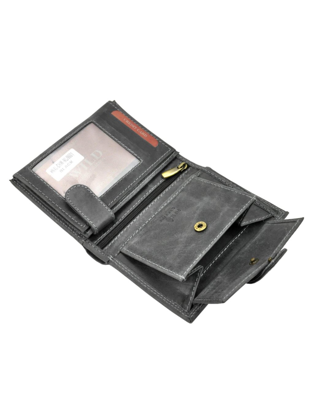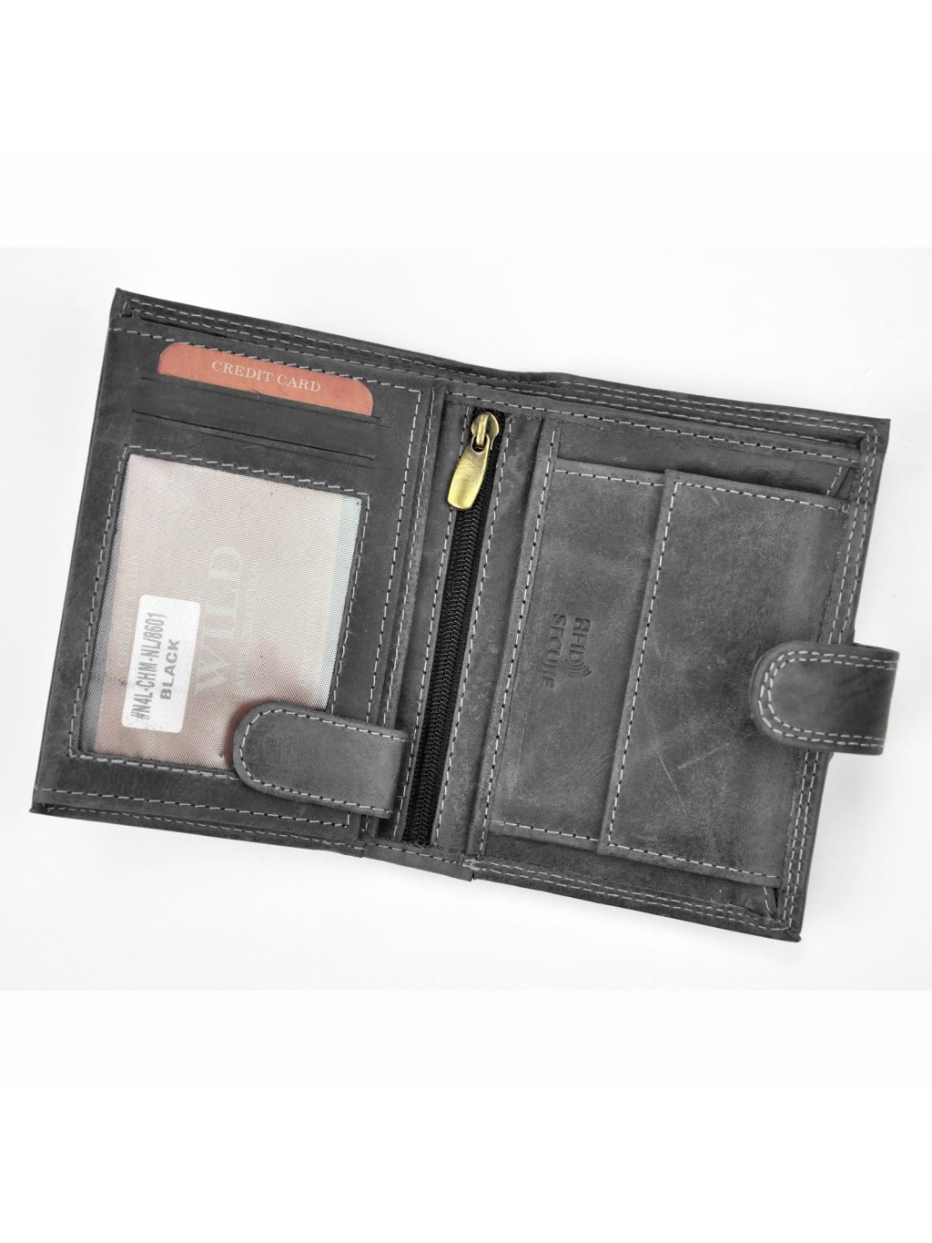 Pánská kožená na výšku orientovaná peněženka značky Wild. Uvnitř peněženky najdete malou kapsičku na mince se zapínáním na druk, přihrádky na doklady, věrnostní karty a kreditní karty. V horní části peněženky jsou fochy na papírové bankovky, které jsou podšité látkovou podšívkou. Peněženka je ušita z kvalitní pravé kůže a po obvodu prošita silnou nití, což zvyšuje její odolnost. Praktická zápinka na druk zajistí, že z peněženky nic nevypadne.