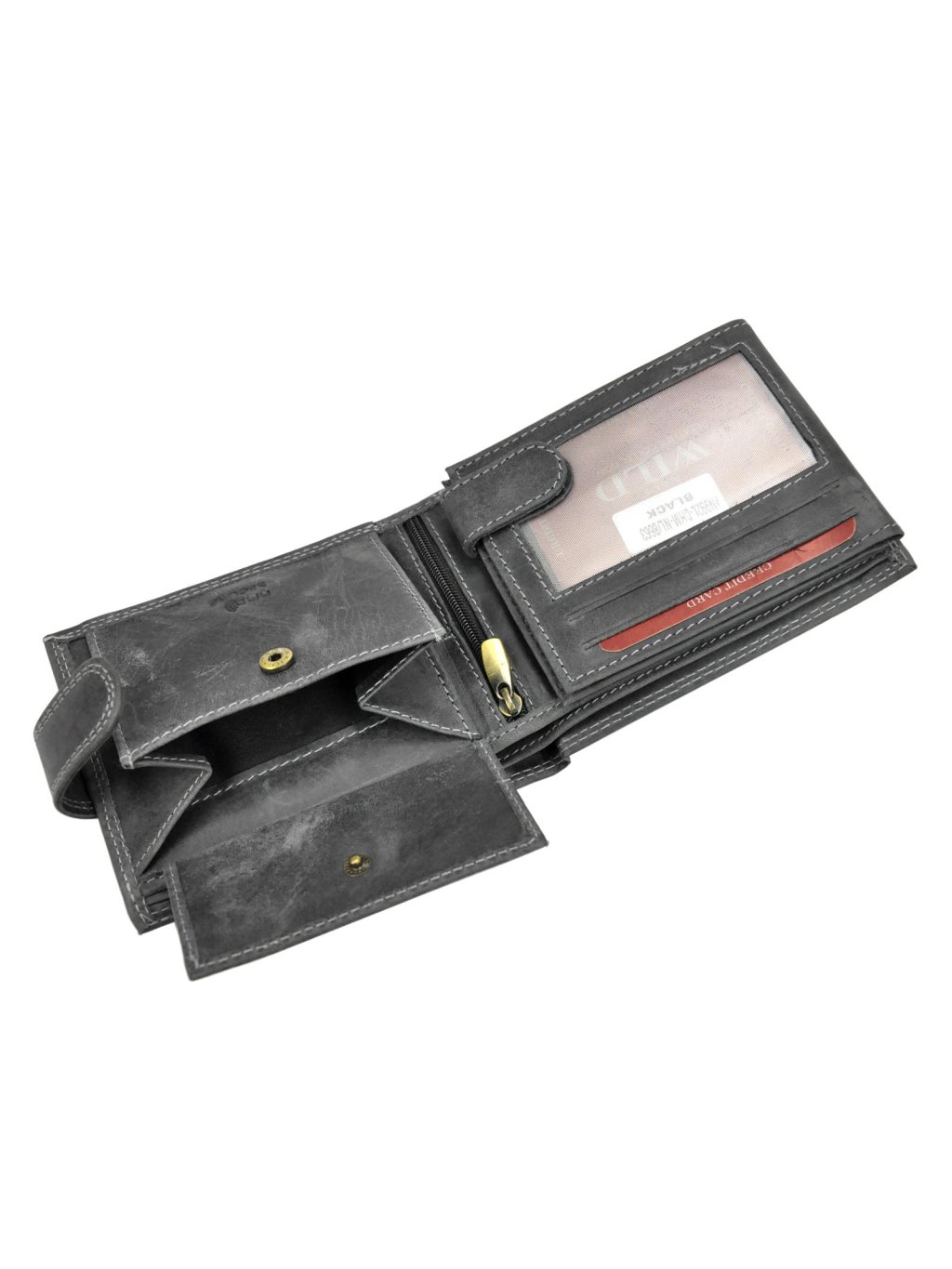 Klasická pánská, na šířku orientovaná peněženka módní značky Wild ušitá z pravé přírodní hovězí kůže, která spolehlivě pojme všechny potřebné doklady, věrnostní karty a kreditky.