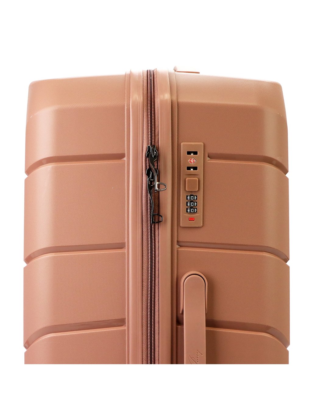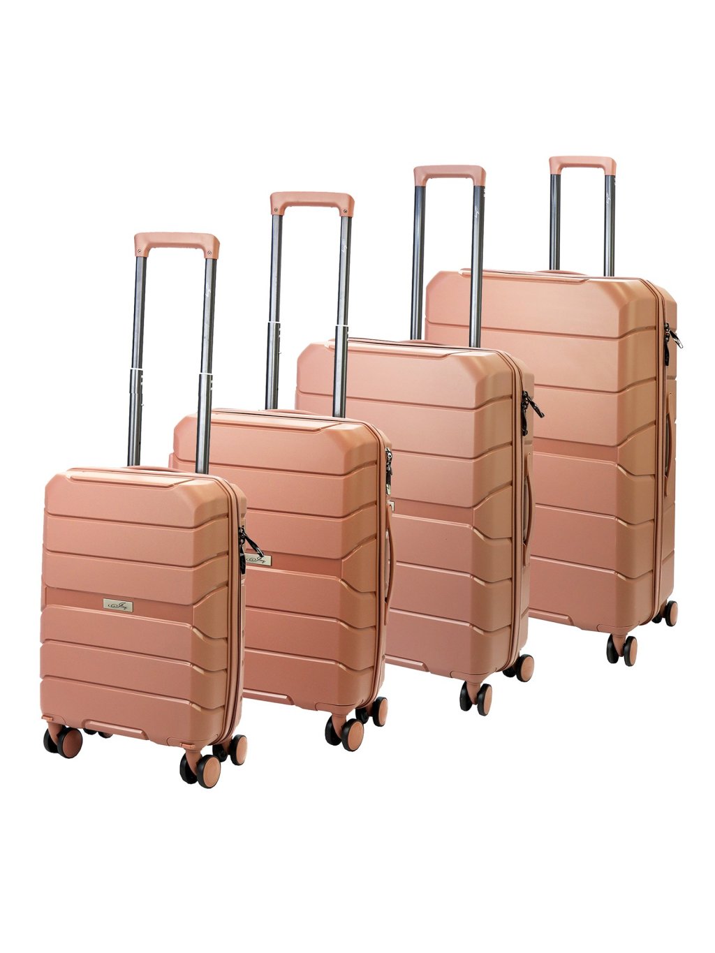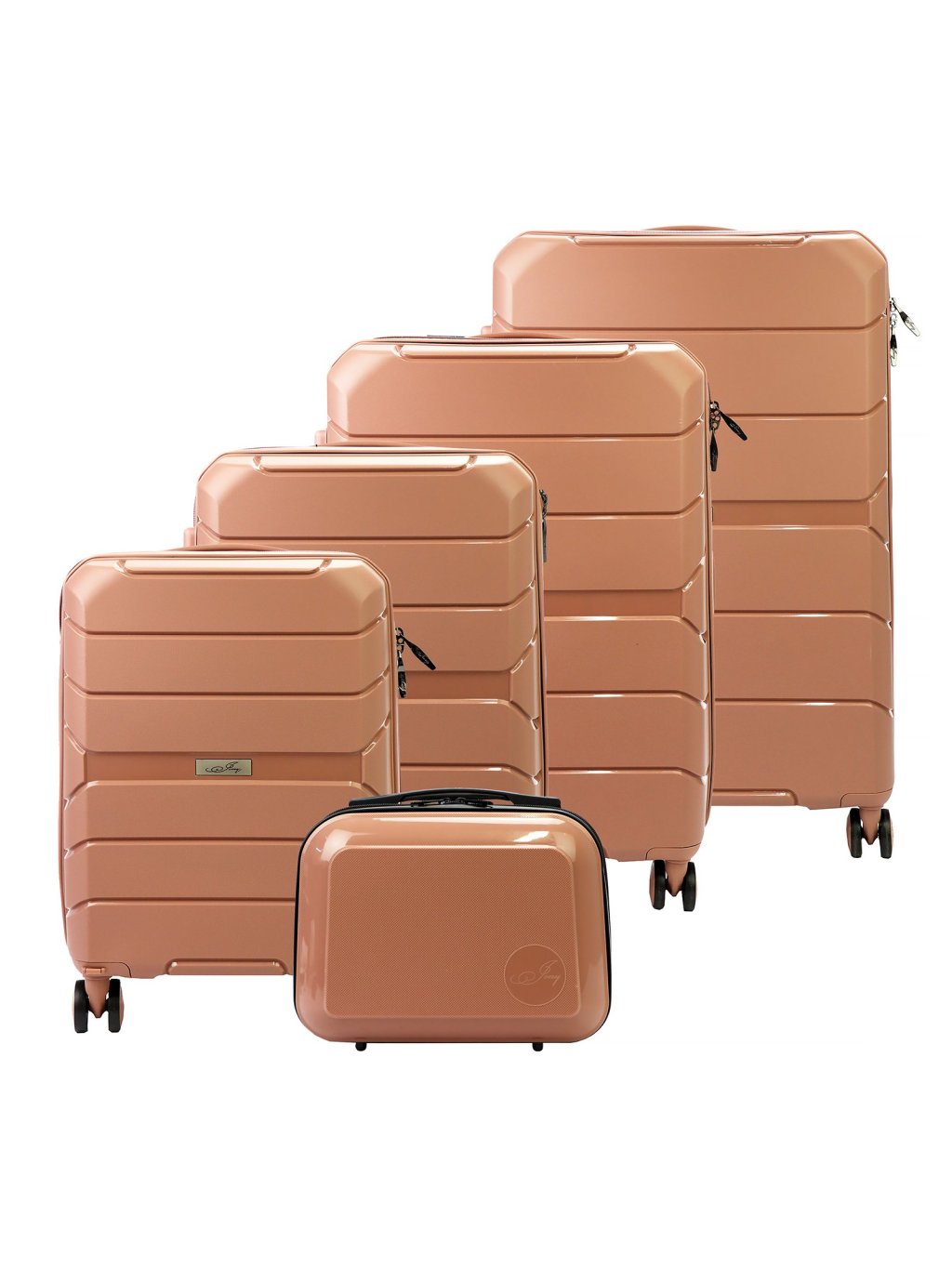 Tato sada pěti cestovních kufrů je vyrobená z kvalitního polypropylenu. Nádherný design uspokojí všechny cestovatele, kteří budou cestovat stylově. Kufry mají čtyři kolečka pro snadnou manipulaci, teleskopickou rukojeť, bezpečnostní zámek, který zabraňuje před nechtěným otevřením. Uvnitř najdeme dvě komory. V jedné je prostor s pružnými popruhy, které zabrání pohybu oděvu. Ve druhé je komora uzavřena zipem. Malý kufřík je skvělý na různé drobnosti či kosmetiku. Kufřík má vzadu umístěný pás, který umožňuje nasadit ho na teleskopickou rukojeť většího kufru. Kufřík lze nosit i v ruce, má totiž rukojeť.