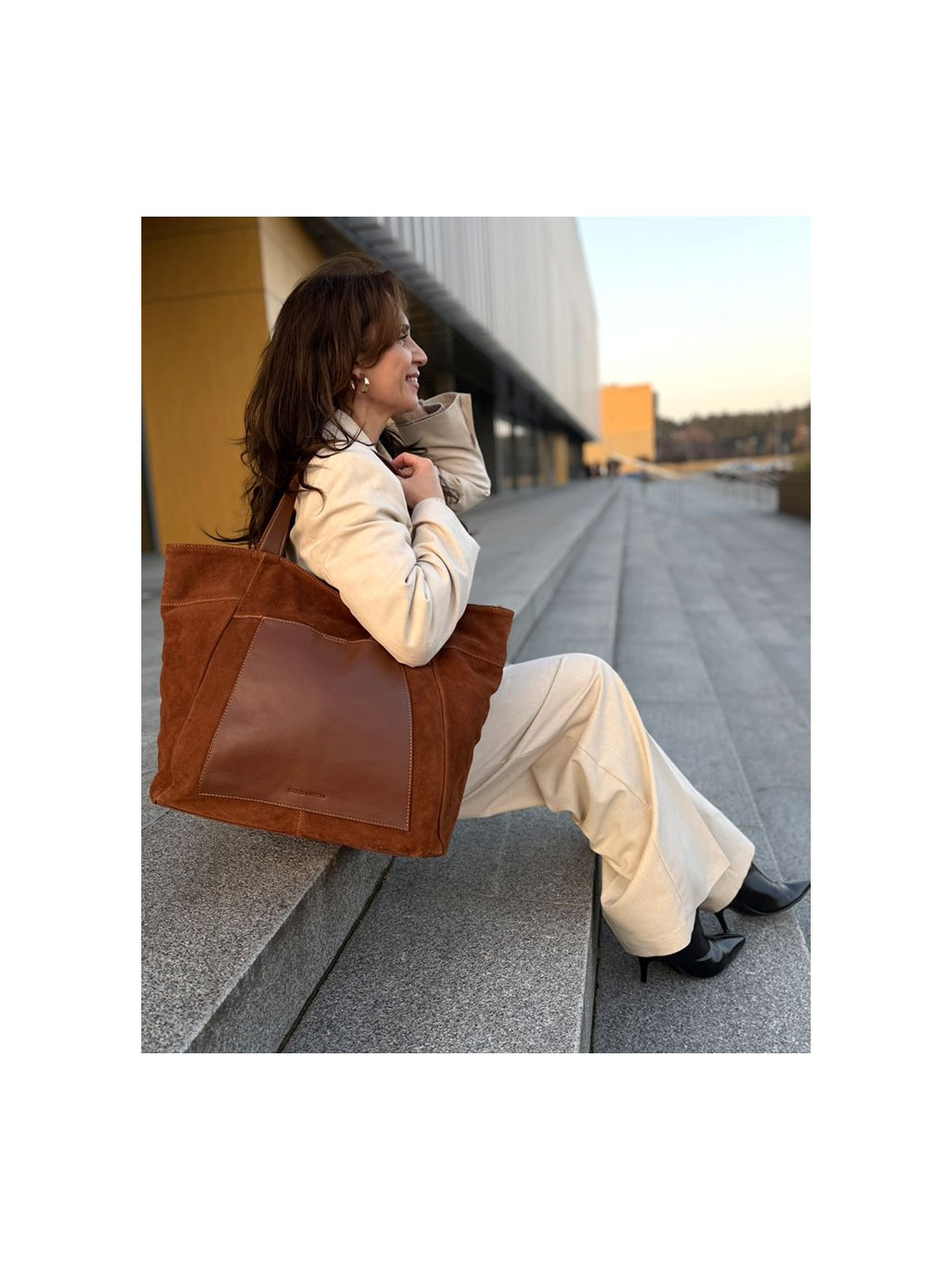 Velká dámská shopper kabelka městského střihu ušitá z přírodního semiše je navržená pro každodenní pohodlné nošení. Měkký semiš s jemnou strukturou působí elegantně a přirozeně podtrhuje nadčasový charakter kabelky. Model je vybaven pohodlnými uchy pro nošení v ruce i přes rameno. Interiér nabízí praktické vnitřní členění s kapsami na drobnosti a je doplněn textilní podšívkou. Na vnější straně se nachází další kapsy pro rychlý přístup k nezbytnostem. Prostorné provedení poskytuje dostatek místa pro vše, co potřebujete mít během dne po ruce. Stylový a funkční doplněk, který se snadno přizpůsobí různým outfitům i každodenním situacím.