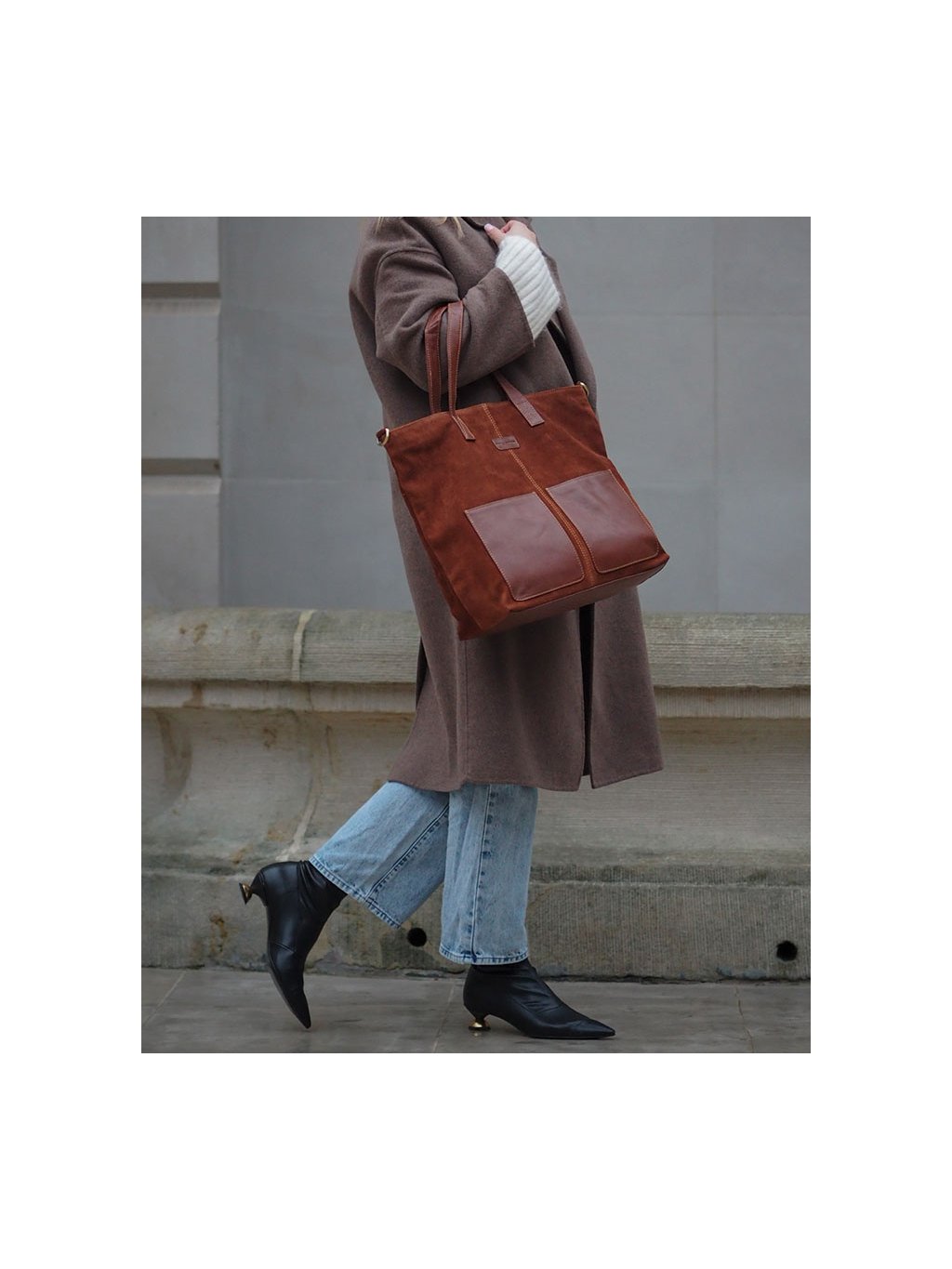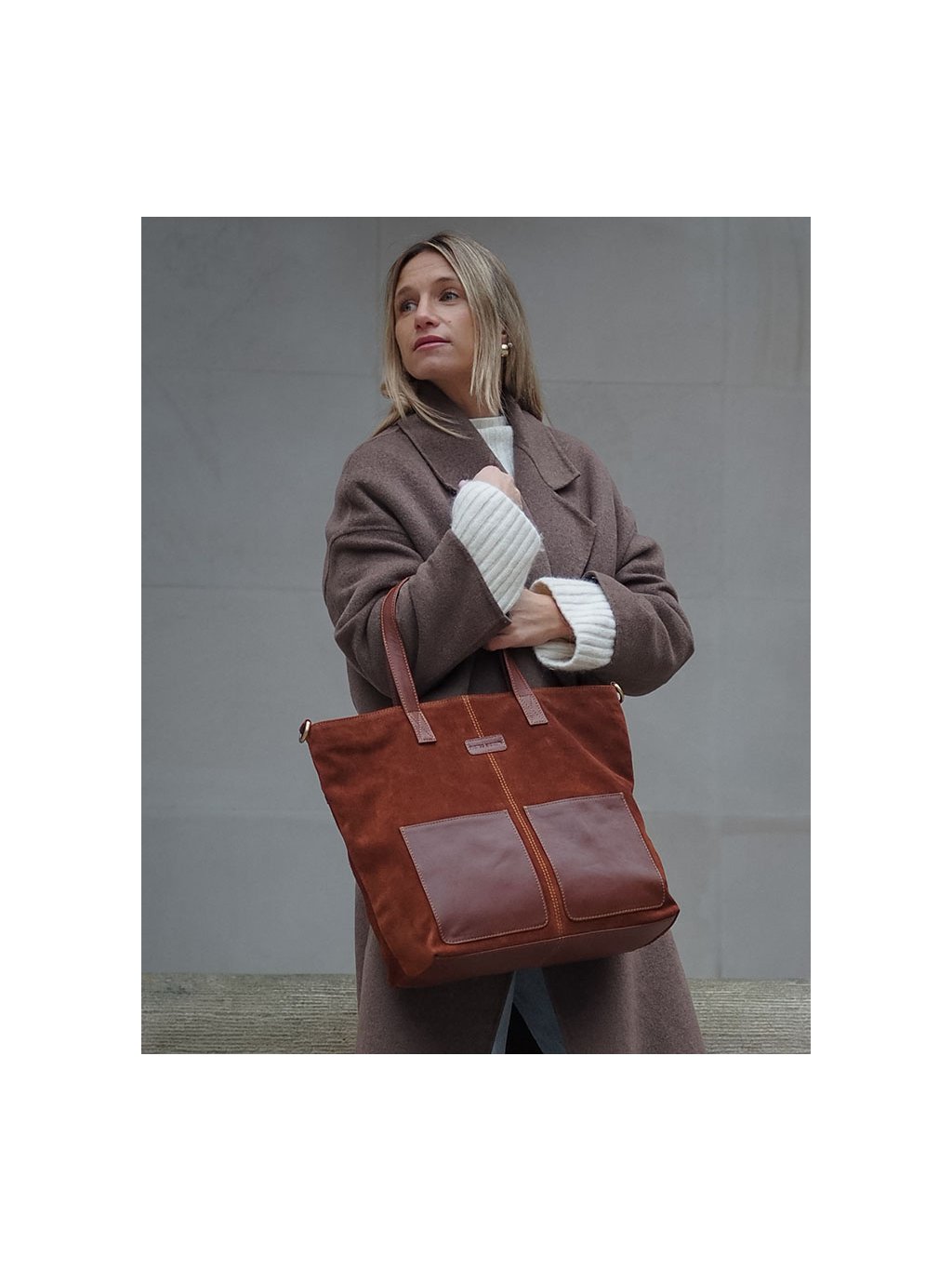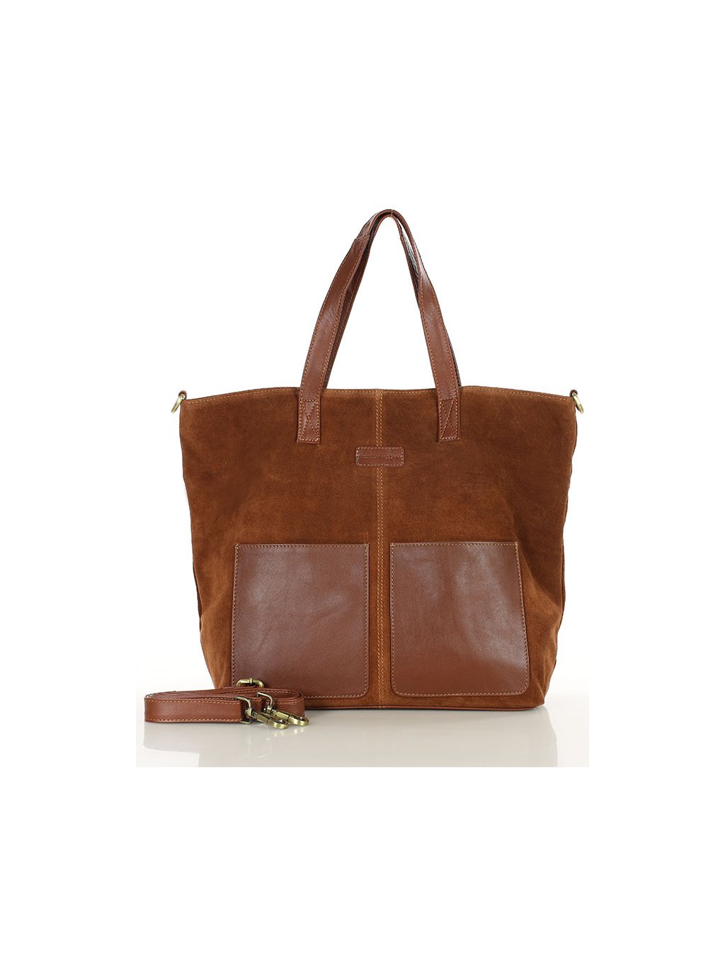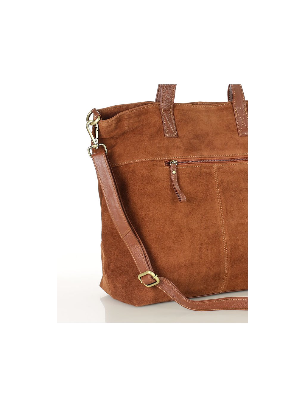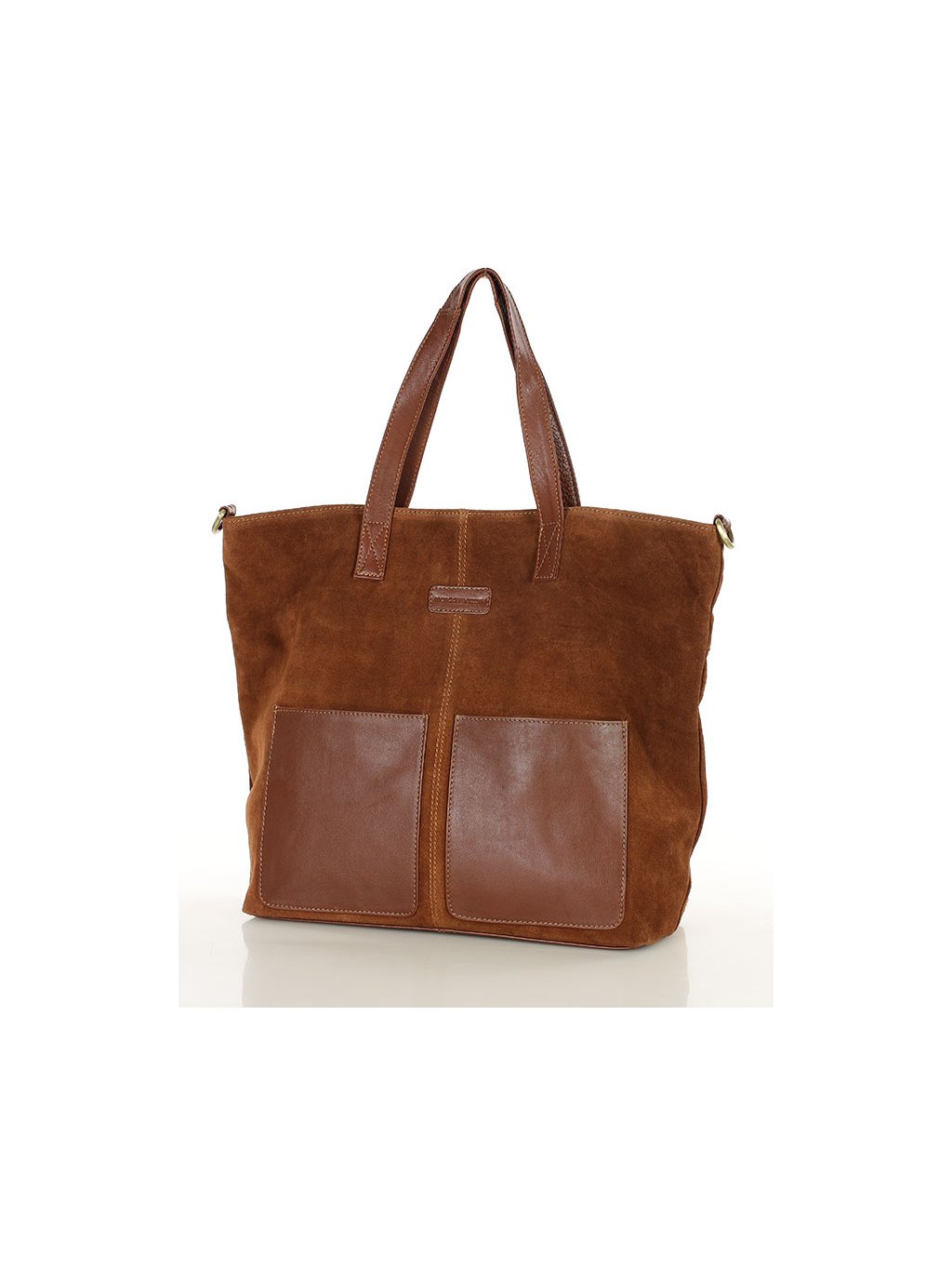 Kožená shopper kabelka z přírodního semiše je praktickým a nadčasovým doplňkem vhodným do práce, do města i na nákupy.