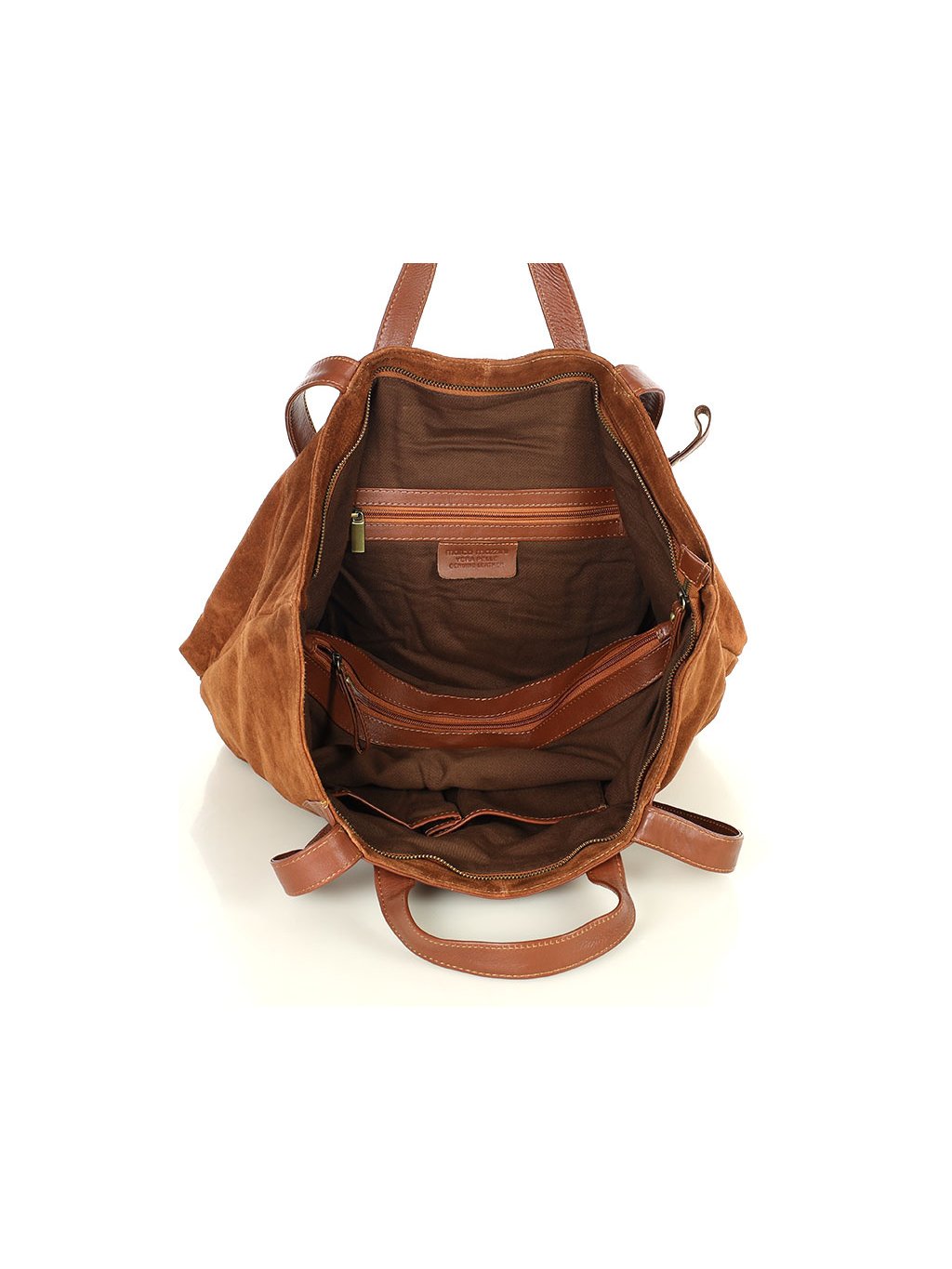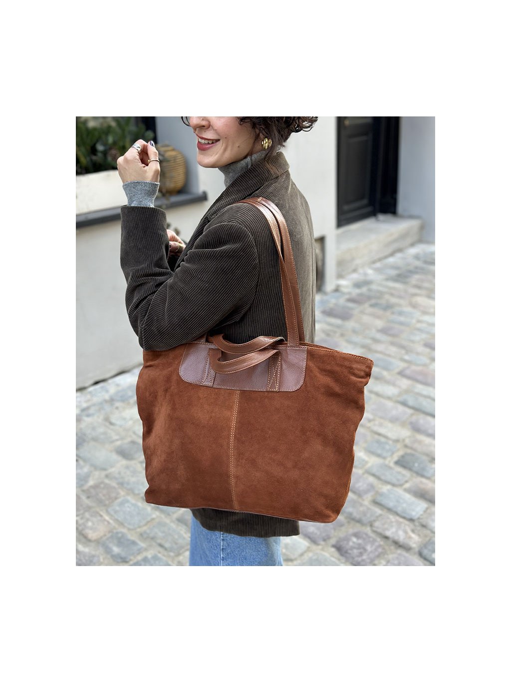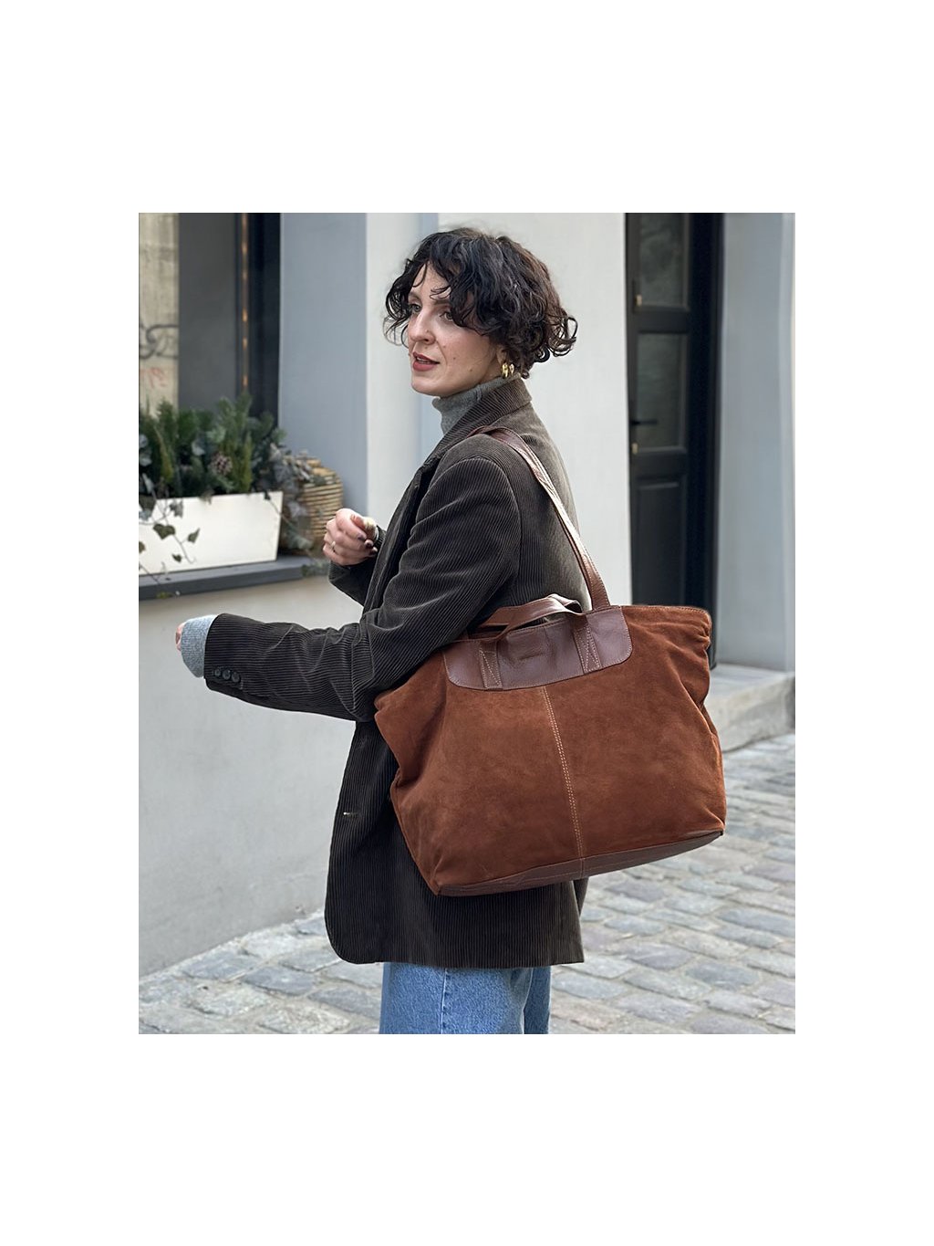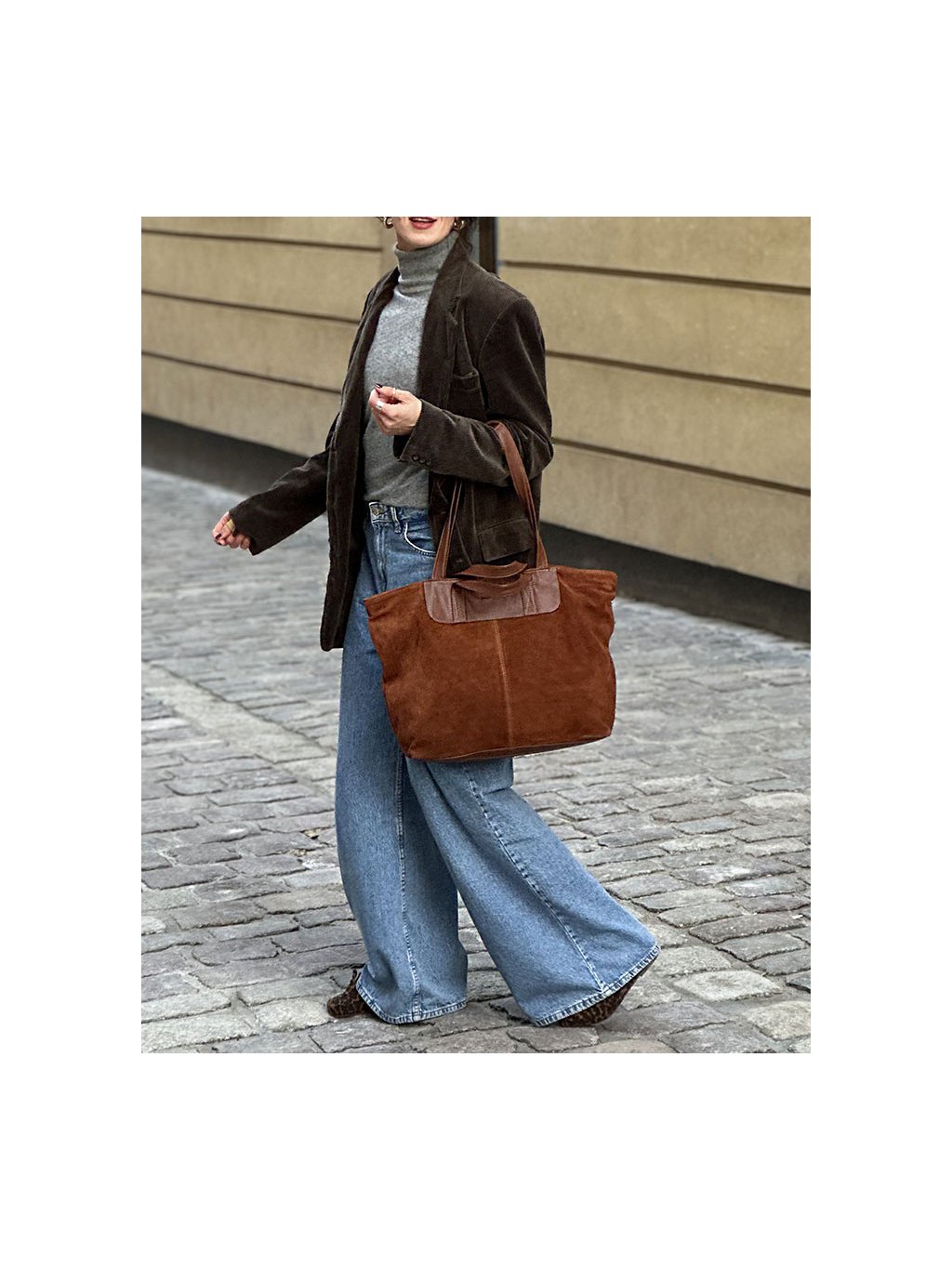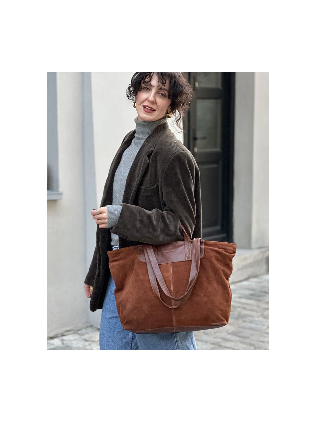 Velká dámská nákupní taška z přírodního semiše v minimalistickém městském stylu Marco Mazzini je ideální volbou pro každodenní nošení, práci i nákupy. Kvalitní semišová kůže s jemnými koženými detaily působí elegantně a nadčasově. Taška má pohodlná dvojitá ucha pro nošení v ruce i přes rameno. Hlavní prostor se uzavírá zipem a nabízí praktické vnitřní členění včetně velké zipové přihrádky, menší kapsy na zip a otevřených přihrádek na drobnosti. Díky své velikosti je vhodná jako pracovní taška, vejde se do ní formát A4 i notebook. Praktické poutko na zadní straně umožňuje uchycení na rukojeť kufru, což oceníte při cestování.